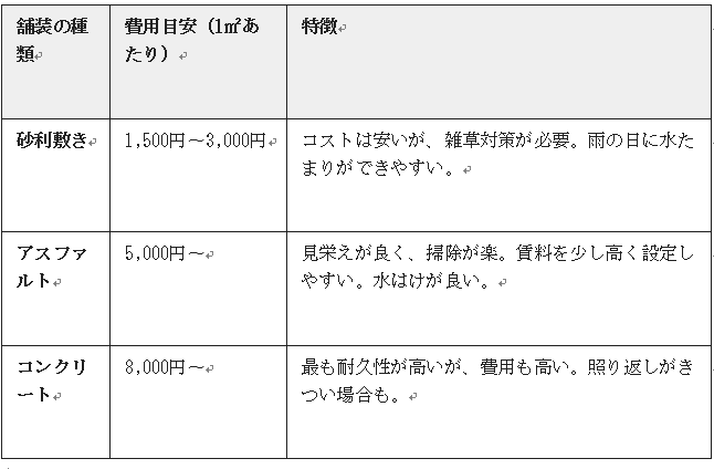 - 安く抑えるコツ: 砂利敷き、相見積もり、DIY、サブリース、補助金の活用