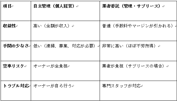 - メリット: 管理手数料(通常、賃料の5〜10%程度)が発生しないため、手残りの現金(キャッシュフロー)を最大化できます。